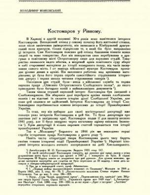 Анотація: Стаття літературознавця і архівіста Володимира Міяковського присвячена історику, поету, мислителю і громадському діячу Миколі Костомарову. Окрему увагу автор приділив становленню наукових інтересів історика, описав захоплення Костомарова, серед них і дослідження архівних документів. Проаналізовано перші наукові праці, детально описано перебування Костомарова у Рівному та викладацьку діяльність. Опубліковано уривки листів Костомарова.