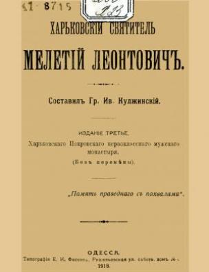 Бібліографічний опис: Харьковский святитель Мелетий Леонтович [Електронна копія] / сост. Гр. Ив. Кулжинский. Изд. 3-е Харьков. Покров. первоклас. муж. монастыря (бер перемен). Электрон. текст. дан. (1 файл : 23,4 Мб). Одесса : Тип. Е. И. Фесенко, 1918 (Харків: ХДНБ ім. В. Г. Короленка, 2015).