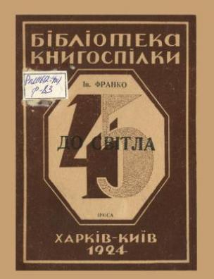 До світла [Електронна копія] : п’єса на 1 дію / Ів. Франко ; інсценував С. Васильченко. Електрон. текст. дані (1 файл : 11,3 Мб). Харків ; Київ : Книгоспілка, 1924 (Київ: НБУ ім. Ярослава Мудрого, 2016). (Бібліотека книгоспілки. Серія красного письменства; № 45).