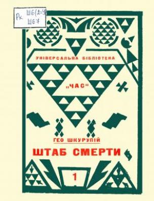 Штаб смерті [Електронна копія] / Гео Шкурупій. Електрон. текст. дані (1 файл : 44,6 Мб). Київ : Час, 1926 (Київ: НБУ ім. Ярослава Мудрого, 2016). (Універсальна бібліотека ”Час”; № 1).