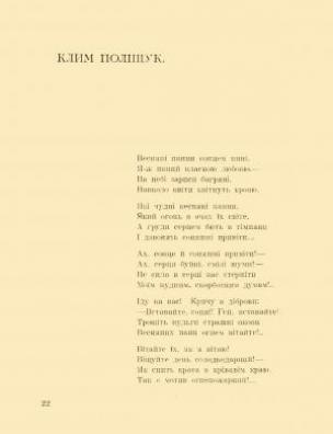 Анотація: Представлено першу публікацію віршів «Весняні панни сонцем п’яні...» та «Замирає акорд перехідний...» письменника, публіциста, автора історичних романів, одного з засновників літературно-мистецького об’єднання «Музагет» Клима Поліщука. Твори були надруковані в єдиному випуску альманаху «Музагет» у 1919 році.