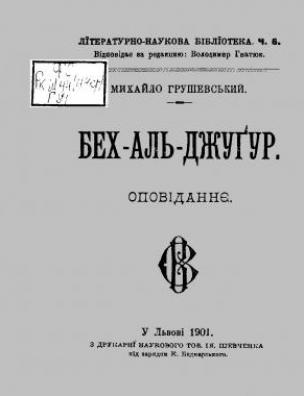 Бех-Аль-Джугур [Електронна копія] : оповіданнє / Михайло Грушевський. Електрон. текст. дані (1 файл : 15,2 Мб). У Львові : З друк. Наук. т-ва ім. Шевченка, 1901 (Київ: НБУ ім. Ярослава Мудрого, 2016). (Літературно-наукова б-ка / за ред. В. Гнатюка; ч. 6).