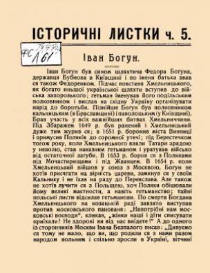 Анотація: Активний учасник політичного життя доби Української революції 1917–1921 років В’ячеслав Липинський (1882–1931) відомий також як історик, соціолог та публіцист. Представлена біографія Івана Богуна була написана на основі праці вченого, опублікованої в альманасі «Z dziejow Ukrainy» («З історії України»), що вийшов польською мовою у 1912 році. Статтю надруковано у п’ятому номері видання «Історичні листки», яке випускав Іван Крип’якевич. Вміщено перелік інших номерів, що вийшли на той час.