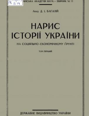Нарис історії України [Електронна копія] : на соц.-екон. грунті / акад. Д. І. Багалій. Електрон. текст. дані. Харків : Держ. вид-во України, 1928 (Київ: НБУ ім. Ярослава Мудрого, 2017). (Українська академія наук. Збірник; № 72). Т. 1 :