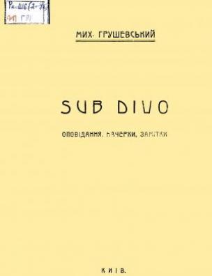 Sub divo [Електронна копія] : оповідання, начерки, замітки / Мих. Грушевський. Електрон. текст. дані (1 файл : 93,3 Мб). Київ : Друк. Акц. т-ва ”Петро Барський”, 1918 (Київ: НБУ ім. Ярослава Мудрого, 2017).