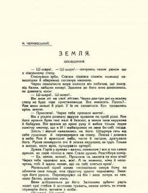 Анотація: Представлено першу публікацію оповідання українського письменника, поета й педагога Миколи Чернявського «Земля» в часописі «Червоний шлях» 1923 року. У творі, датованому автором 1919 роком, зображено трагедію Петра Стасюка, який, повіривши в обіцянки про землю і взявши на себе відповідальність представляти інтереси свого села, несподівано для себе стає найстрашнішим ворогом власних односельців.