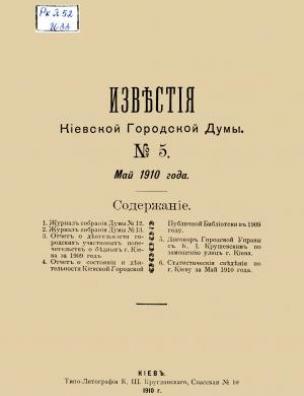 Анотація: У номері представлено журнали зібрань Київської міської думи. Опубліковано звіт про стан і діяльність Київської міської публічної бібліотеки (зараз – Національна бібліотека України імені Ярослава Мудрого) у 1909 році. Вміщено статистичні відомості по місту Києву за травень 1910 року, зокрема відомості про кількість народжених та померлих, ціни на продовольчі товари, рух коштів у касі Міської управи, метеорологічні дані тощо.