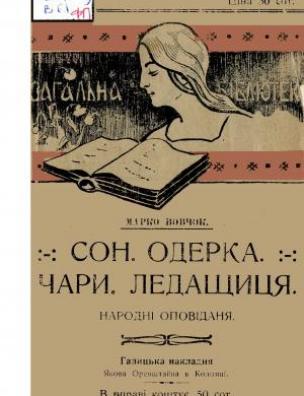 Сон ; Одарка ; Чари ; Ледащиця [Електронна копія] : нар. оповідання / Марко Вовчок. Електрон. текст. дані (1 файл : 39,5 Мб). Коломия : Галиц. накладня Я. Оренштайна в Коломиї, [1912?] (Київ: НБУ ім. Ярослава Мудрого, 2018). (Загальна бібліотека).