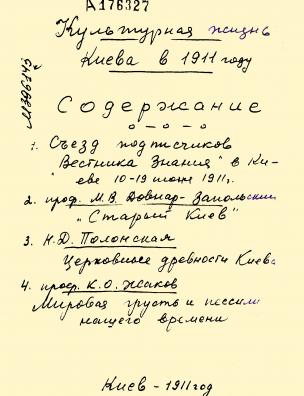 Оригінал друкованого документу зберігається в НБУ ім. Ярослава Мудрого: Культурная жизнь Киева в 1911 году. — Киев : [б. и.], 1911. — 128 с. : ил.